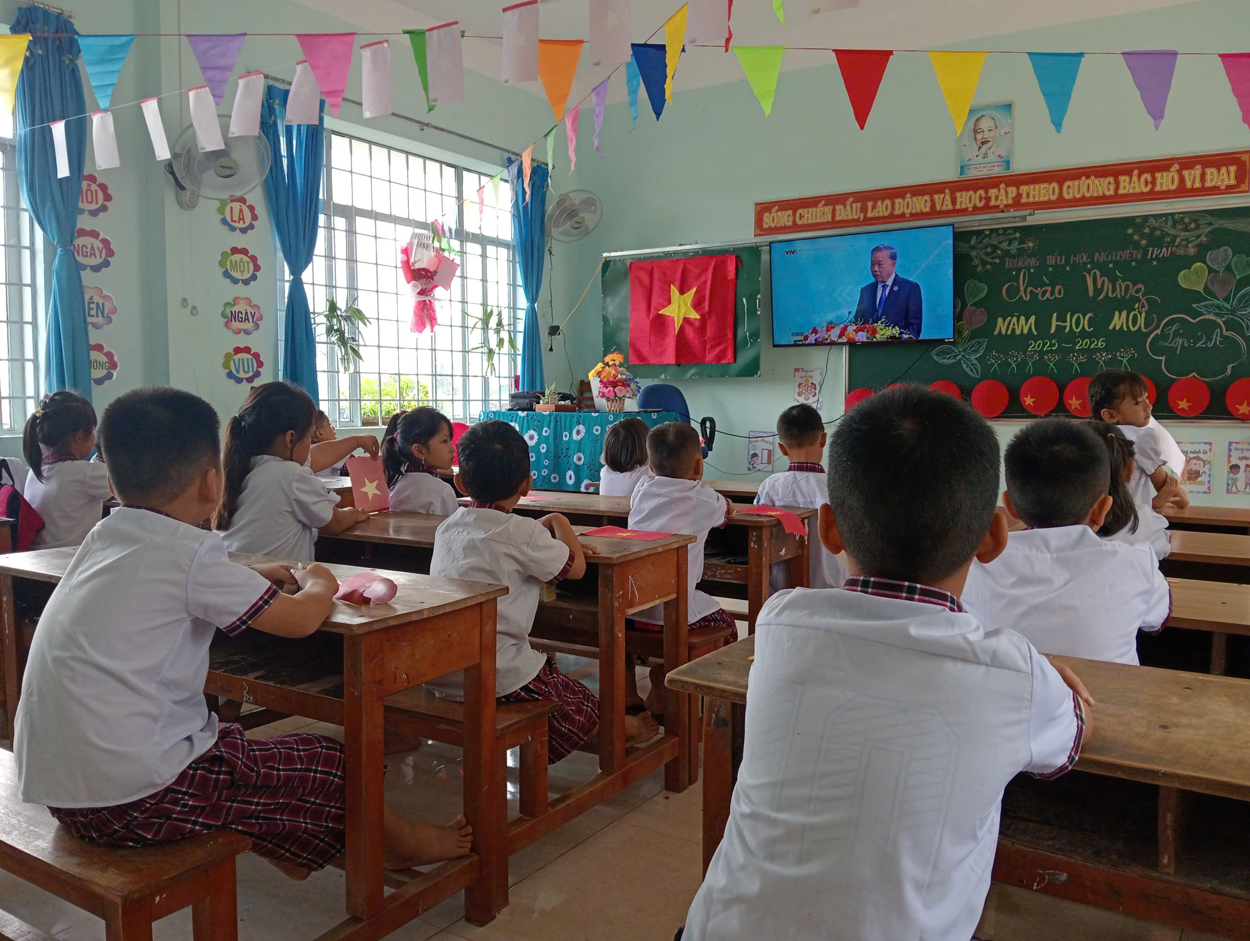 Tiếp nối cho buổi lễ khai giảng của nhà trường, là sự dõi theo lễ khai giảng trực tuyến do Bộ Giáo dục tổ chức qua màn hình Tivi. Hơn 300 học sinh, thầy cô, khách mời, phụ huynh học sinh…. chăm chú dõi theo từng phần của buổi lễ. Gửi gắm niềm tin, niềm hi vọng vào những chủ nhân tương lai của đất nước, trong bài phát biểu của mình tại buổi lễ, Tổng Bí thư Tô Lâm đã nói: “Ngành giáo dục cần tiên phong trong đổi mới tư duy, phương pháp quản trị; xây dựng đội ngũ nhà giáo vừa có tri thức, vừa có đạo đức và khát vọng cống hiến. Các thầy cô giáo phải là tấm gương sáng, là nguồn cảm hứng cho học trò. Các cháu học sinh, sinh viên phải nuôi dưỡng chí lớn, khát vọng lớn, học tập và rèn luyện để trở thành công dân toàn cầu, từng bước hội nhập chuẩn mực quốc tế nhưng luôn giữ vững bản sắc và tâm hồn Việt Nam”. Đây cũng chính là con đường đang đi, cũng là mục tiêu hướng tới mà thầy và trò trường TH Nguyễn Trãi đang cùng nhau thực hiện.